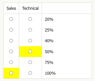 Technical percent increases in the number of employees that the sales department and the technical department, respectively could have experienced during expansion, such that the percent increases are jointly consistent with the information provided. Make only 2 selections, one in each column.