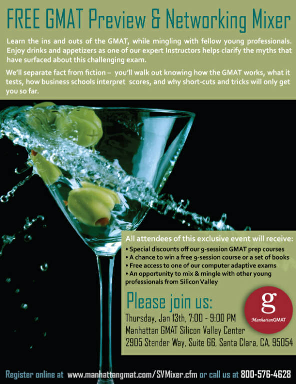Learn the ins and outs of the GMAT, while mingling with fellow young professionals working at top companies in and around Silicon Valley.