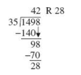 *You can also find the remainder on the calculator as follows. 1498 divided by 35 = 42.8. Subtract the whole number part to get the decimal remainder: 42.8 – 42 = 0.8. Multiply this result by the number you divided by: 0.8 × 35 = 28. This means that 28 is the remainder.