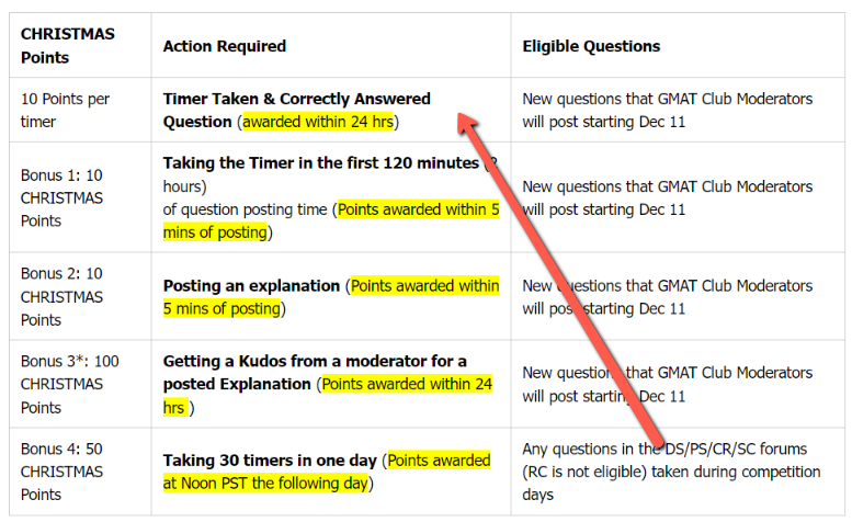 | Bonus 1: 10 CHRISTMAS Points | Taking the Timer in the first 120 minutes (2 hours) of question posting time (Points awarded within 5 mins of posting) | New questions that GMAT Club Moderators will post starting Dec 11 |