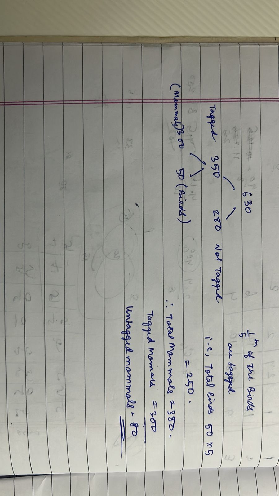 - The number of tagged mammals is (6/(6+1))×350=(6/7)×350=300