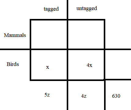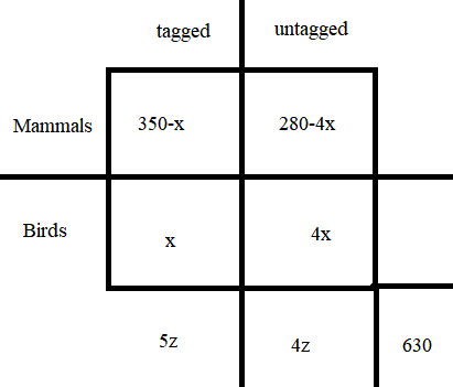Among the tagged animals, the ratio of mammals to birds is 6:1. Thus, of the 350 tagged animals: