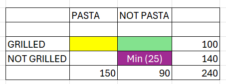 | Not grilled | 115-x | 25+x | 240-100=140 |