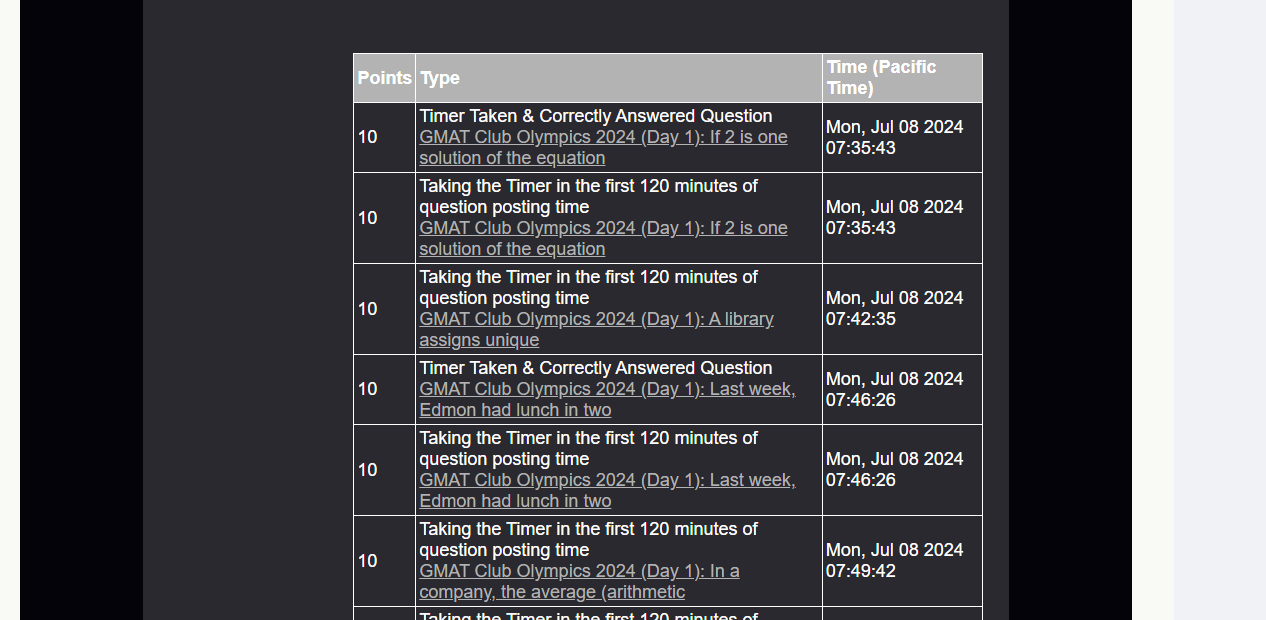 | 34 | @Oppenheimer1945 | 7700 | Team Green | TTP GMAT Flex Prep 1 Month ($229 value) |