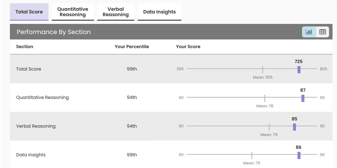 Quantitative: Q79 to Q87I have had a contentious relationship with math since I can remember. So, when I decided to take the GMAT, I was intimidated by the Quant section, as well as quantitative elements spilling into Data Insights through Data Sufficiency, graphs, and tables. I think the improvement in Quant was the biggest mover in my total score, particularly given how the GMAT indexes Quant skills (i.e., an equivalent score is a lower percentile for Q than for V or DI). That's why going from the 57th percentile to the 94th percentile feels like a major accomplishment.
