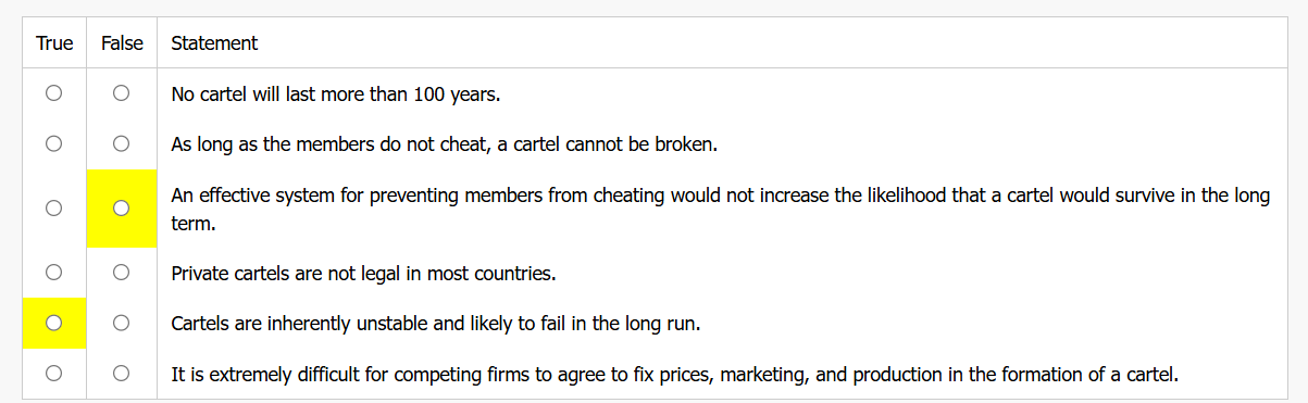 | An effective system for preventing members from cheating would not increase the likelihood that a cartel would survive in the long term. | ||