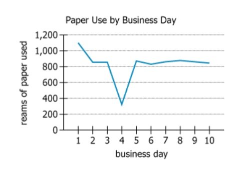 A certain large company typically uses between 800 and 900 reams of paper per business day (a ream of paper is 500 sheets of paper). There are two exceptions to this pattern of use: on the last business day before a company holiday (a company holiday is not a business day), the company uses significantly less paper because a large number of employees take leave, and on the last business day of a month, monthly reports are produced, which significantly increases paper use. For each of 10 consecutive business days, the graph shows the number of reams of paper used on that day.