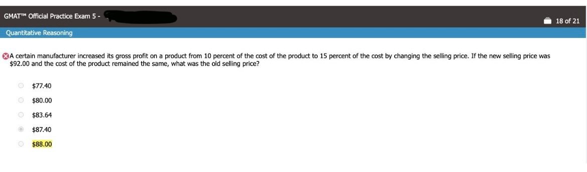 \(\frac{92*100}{215}\) * \(\frac{210}{100}\)Old SP = (92 * \(\frac{100}{115}\) ) * \(\frac{110}{100}\) = $88I so hope that helps. Your formula was fine. (Hard, but fine.) I just redid your math, and voila, the answer!