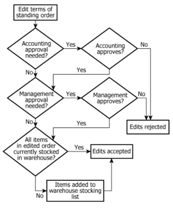 A certain wholesaler supplies goods on a regular schedule to various retailers. A retailer can choose to receive the same numbers and types of goods on a regular basis without having to submit a new order for each delivery using what is called a standing order. The flowchart represents all of the steps in the process for evaluating and accepting or rejecting a request to edit a standing order with the wholesaler. The process begins with "Edit terms of standing order."