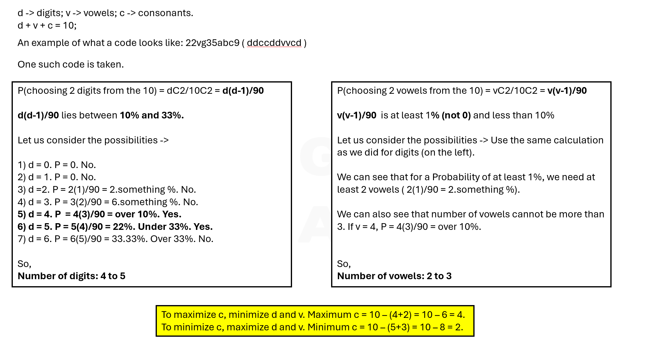 Vowel: The probability of choosing two vowels from the digits/alphabets used in the code is at least 1% but less than 10%. So, there could be 2 or 3 vowels in the code.