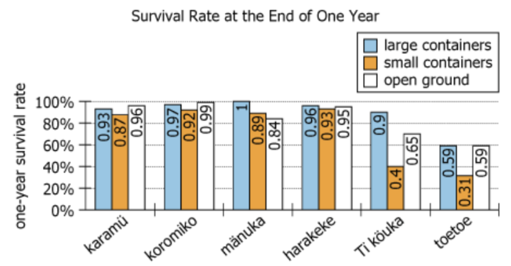 | They had higher survival rates after one year when grown in open ground rather than in either small or large containers. | ||