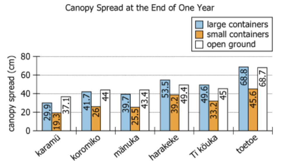 | They had both higher survival rates and larger canopy spreads after one year when grown in large containers rather than in small containers or open ground. | ||
