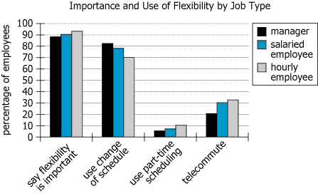 This is how you will read the graph: The key tells us that the black bars are for managers, blue for salaried employees and the grey for hourly employees. The y axis gives us the percentage of employees. So about 88% managers say that Flexibility is important while 93% hourly employees say that flexibility is important. Hence, hourly employees are more likely to say flexibility is important that managers.