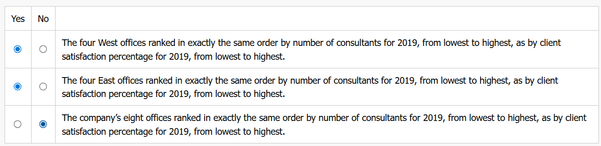 | The company’s eight offices ranked in exactly the same order by number of consultants for 2019, from lowest to highest, as by client satisfaction percentage for 2019, from lowest to highest. |