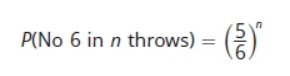 n throws yields a 6. The probability of a single throw not yielding a 6 is \(\frac{5}{6}\), and because each throw is independent, the cumulative probability of none of the