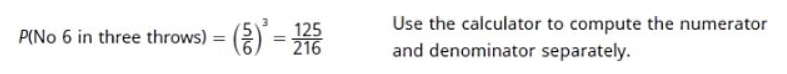 You may have figured intuitively that given three throws, the chance of getting at least one 6 would be \(\frac{3}{6}=\frac{1}{2}\). But if you extend this reasoning, it soon breaks down. If you had six throws, you couldn’t say that you had a 100% chance of rolling a 6, and if you had more than six throws, you certainly wouldn’t want to say the chance was now