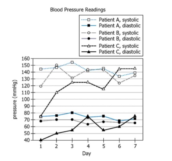 1.1 The correlation between the systolic and diastolic pressure readings is weakest for Patient ____________.Kindly refer the image for details:
