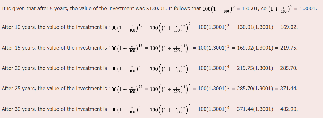 \(100((1+\frac{r}{100})^5)^2=130.01*(1+\frac{r}{100})^5=130.01*1.3001\)