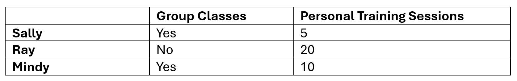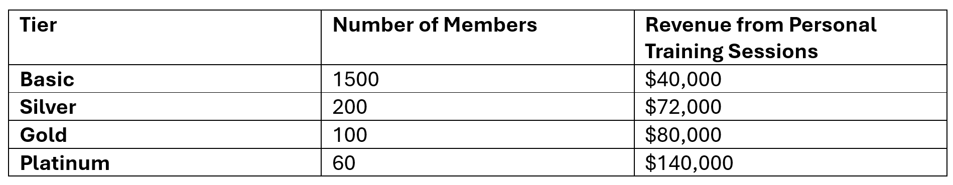 Q3. Which tier generates the most revenue for the gym?Calculation for total revenue (membership fees + personal training revenue) for each tier: