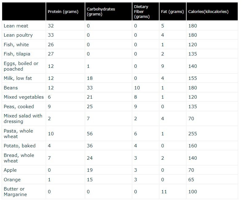 | Lean poultry, baked potato, margarine, cooked peas, whole wheat bread, apple. | |