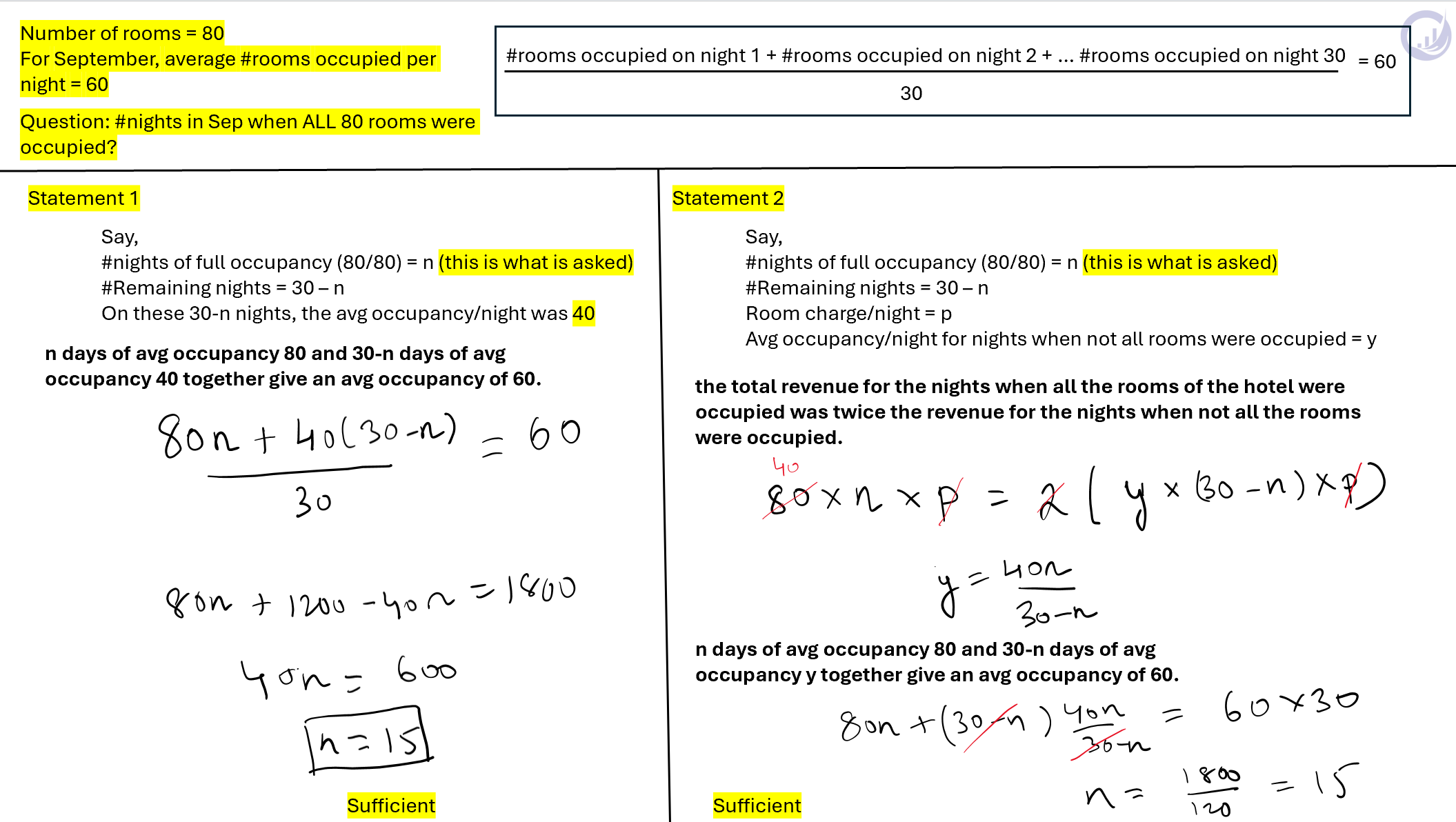 A hotel has 80 rooms and charges the same amount per night for each occupied room. This is the hotel's only source of revenue. In September, the average (arithmetic mean) number of rooms occupied per night was 60. How many nights in September were all the rooms in the hotel occupied?