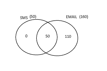 • (Email yes, SMS no) = total - (Email yes, SMS yes) - (Email no, SMS no) = 200 - 50 - 40 = 110