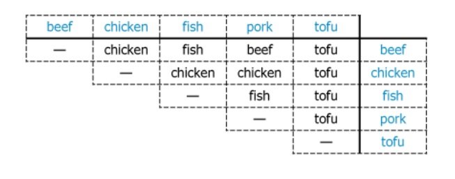 In the graphic, the cells other than column headings or row labels contain the group’s preferred dishes. Pork does not appear in any of these cells, and thus every other dish was preferred when compared to pork.