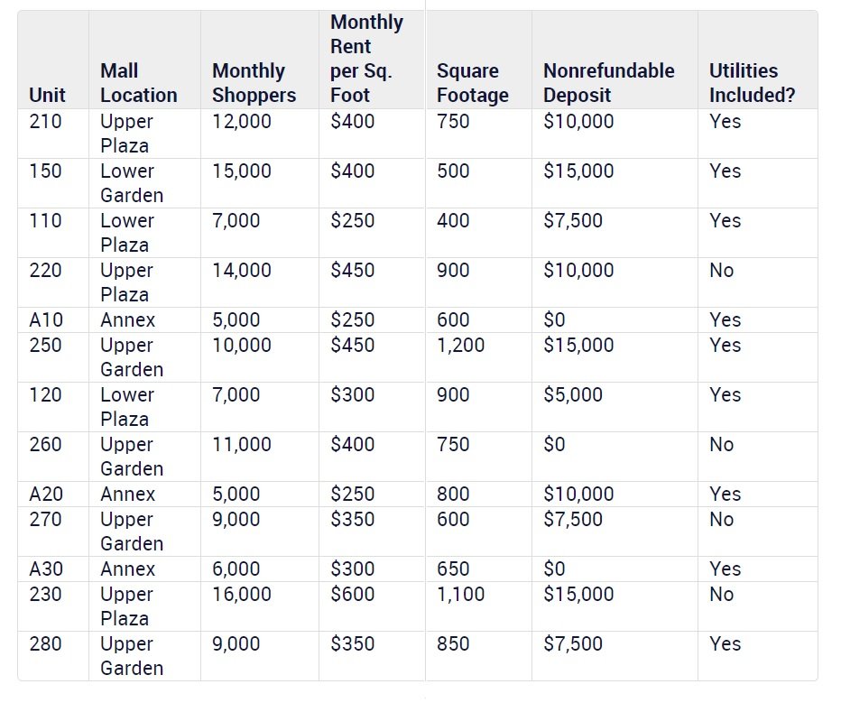 | The unit in the Upper Plaza that will generate the highest estimated gross sales (sales before expenses) is unit 230. | ||