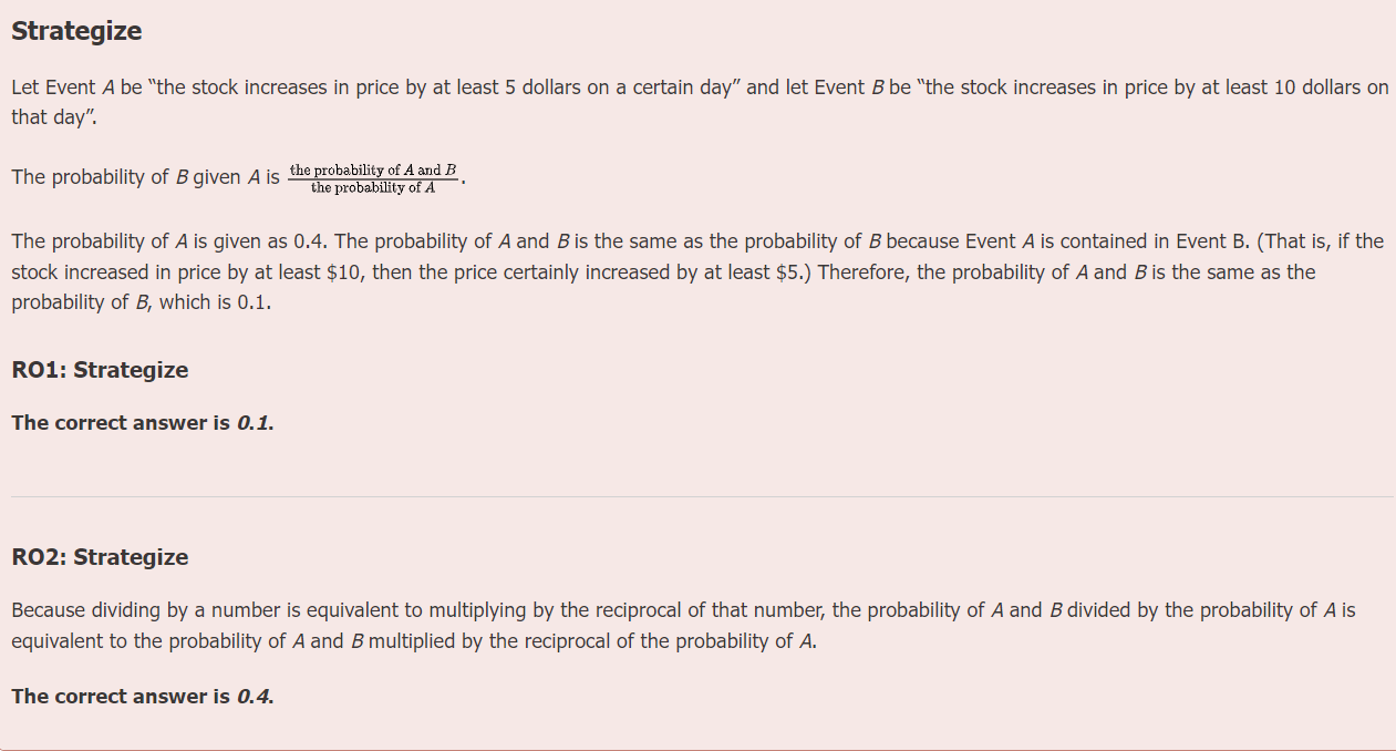 Y____, then the result is the probability that the price of the stock will increase by at least 10 dollars during the trading day, given that the price increases by at least 5 dollars during the trading day.