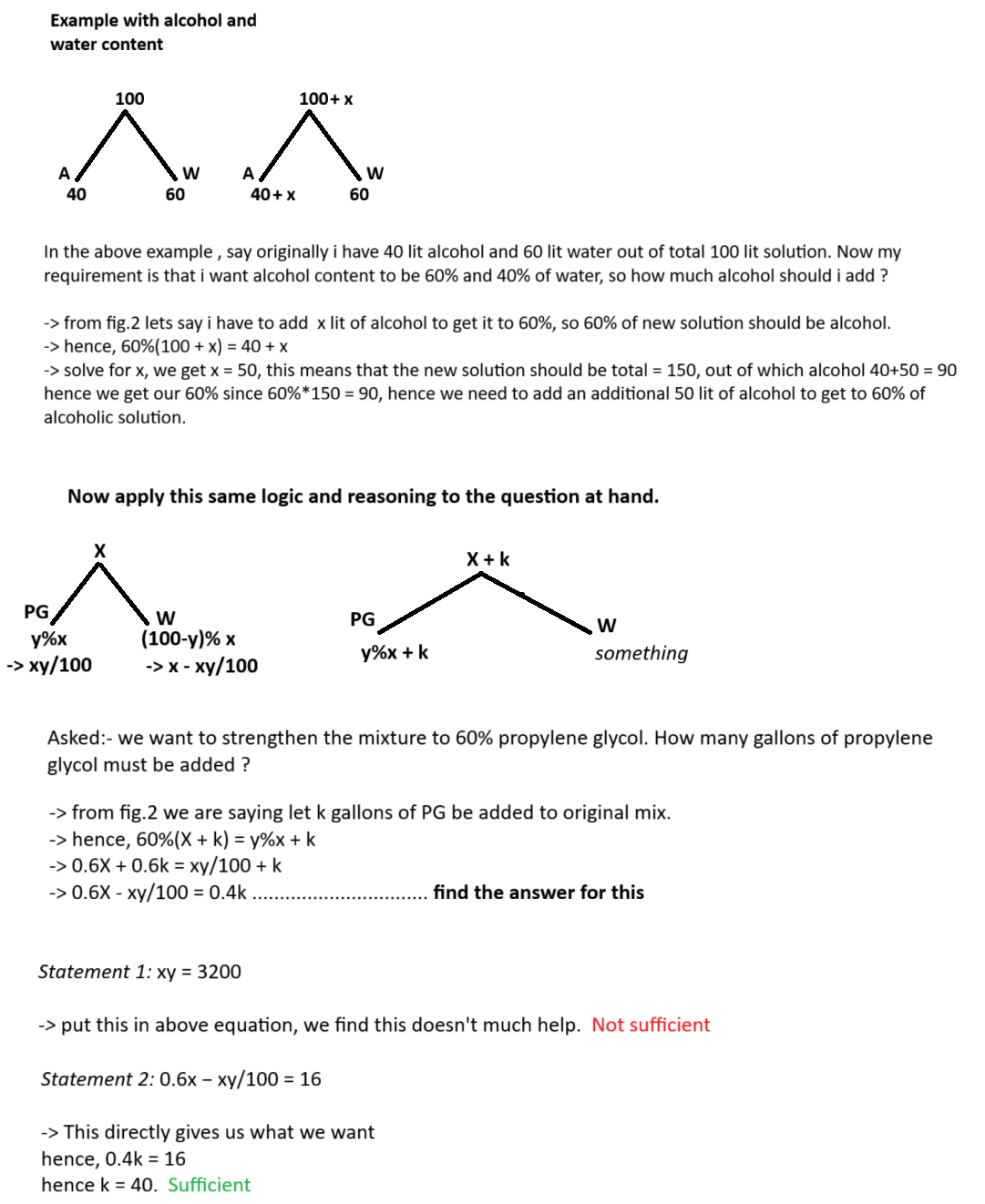 Statement 2(2) 0.6x - \(\frac{xy}{100}\) = 16From the pre-analysis we know that \(0.6x - \frac{xy}{100} = 0.4V\)