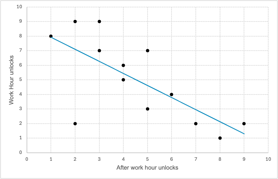 A team of behavioral scientists studied the screen time habits of 13 professionals over a 24-hour period. For each individual, the researchers recorded the number of times they unlocked their work phone during working hours (9:00 a.m. to 5:00 p.m.) and outside of working hours (5:00 p.m. to 9:00 a.m.). The scatterplot shows the results, with each point representing one participant. The horizontal axis shows after-hours phone unlocks; the vertical axis shows unlocks during work hours. A line of best fit is also shown.