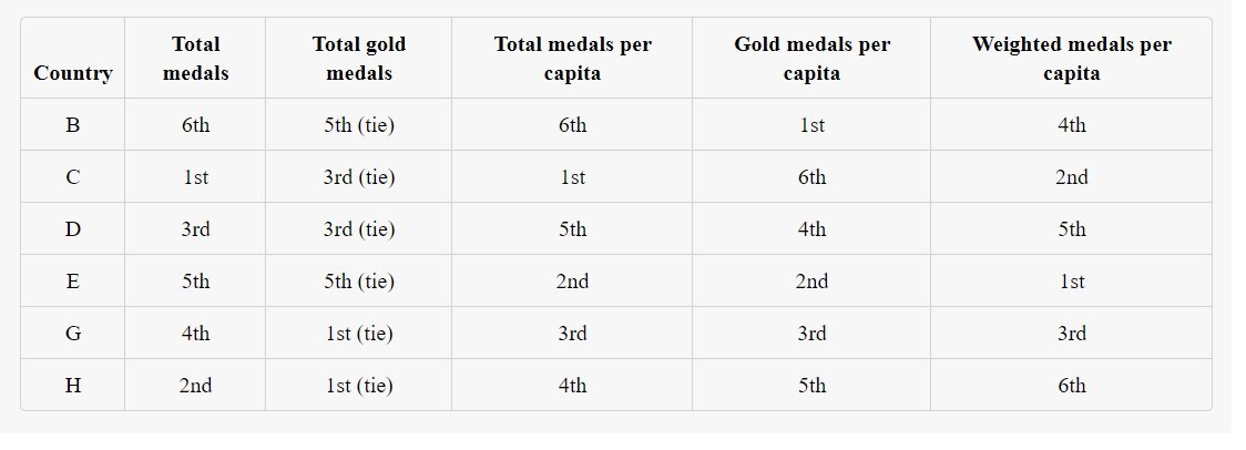Ahmed believes that Olympic success should be measured by a simple count of all medals won by a country. Aisha’s method weights the medals according to type (gold, silver, or bronze) rather than simply counting them, so Ahmed’s method is not compatible with hers.