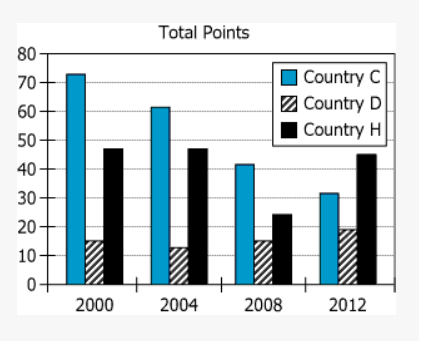 As explained in the analysis of RO2, four points on the graph is equivalent to one weighted medal. Thus, in 2012 Country H had more weighted medals (44÷4=11) than did Country C (32÷4=8) or Country D (19÷4=4.75). Since Countries B, E, and G have point totals lower than Country D, Country H had more weighted medals in 2012 than did any of the other five countries.