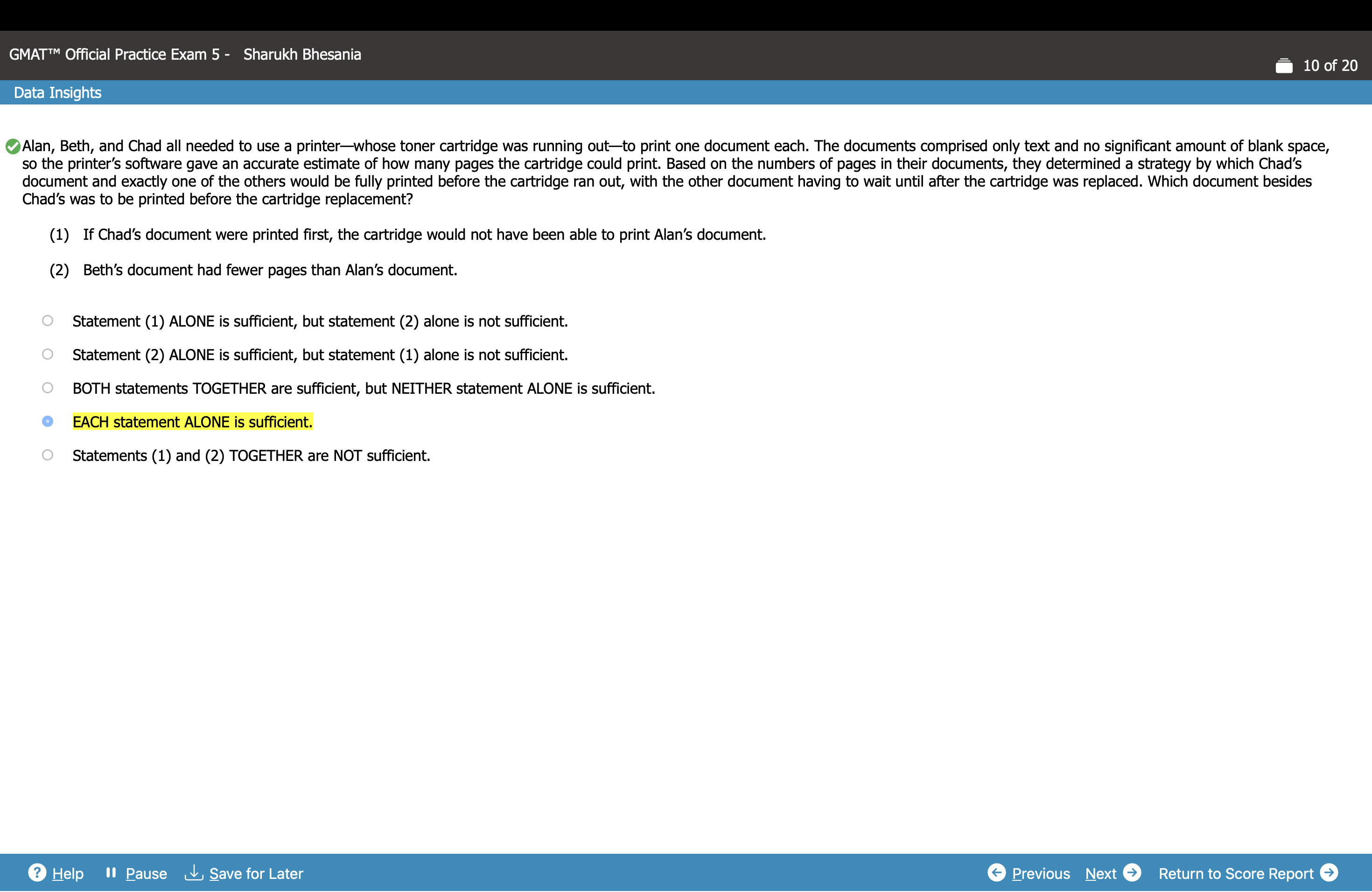 Alan, Beth, and Chad all needed to use a printer—whose toner cartridge was running out—to print one document each. The documents comprised only text and no significant amount of blank space so the printer's software gave an accurate estimate of how many pages the cartridge could print. Based on the numbers of pages in their documents, they determined a strategy by which Chad' document and exactly one of the others would be fully printed before the cartridge ran out, with the other document having to wait until after the cartridge was replaced. Which document besides Chad's was to be printed before the cartridge replacement?Strip the story away, and the question says this: Chad plus