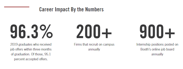 Campus InterviewingLast year, nearly 150 firms visited Chicago Booth to interview students for jobs—companies such as McKinsey & Company, Apple, Tencent, Amgen, Backcountry, PepsiCo, Goldman Sachs, and Dimensional Fund Advisors.
