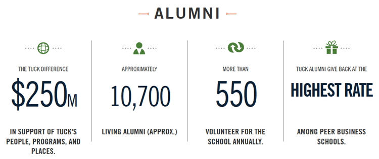 AlumniTap into the world’s most responsive alumni network. Our extraordinarily distinguished, loyal, and supportive global network of alumni generously provides teaching, counsel, and networking opportunities across our community and is deeply invested in Tuck’s success and yours.