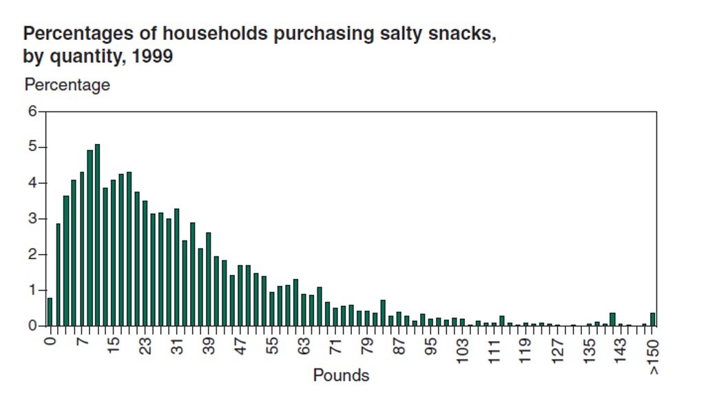 2) Approximately one-fifth of all households consumed 10 pounds or fewer of salty snacks in 1999.Note how the prompt mentions the modal is 10-12 pounds, we can observe there are 6 bars before the highest bar. Thus the 1st bar represents the number of households who purchased 0 pounds, and we have 0-2, 2-4, ..., 8-10 for the next 5 bars. Adding those 6 bars up gives us roughly 20, which represents 20% of the households. Thus this statement is