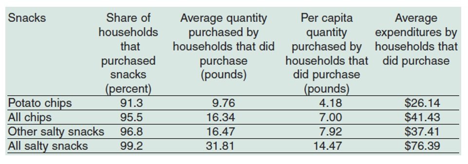 each household that purchased salty snacks would purchase 31.81 pounds on average. Thus, 50 million households would purchase \(50 \text{ million} * 99.2\% * 31.81 = 1577.776 \text{ million pounds}\) of salty snacks.