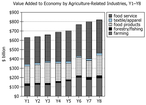 An economic council evaluated the agriculture-related industries of a certain country's overall economy. The stacked-bar graph shows for each of eight consecutive years (Y1–Y8) the value added to the country's economy by each of five agriculture-related industries: food service, textile/apparel, food products, forestry/fishing, and farming.