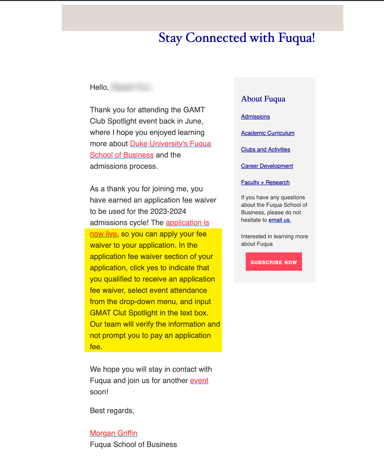 We're thrilled to see you were able to stop by our breakout room at GMAT Club's MBA Spotlight – thanks for your interest in our MBA program. We'll continue to share more information about our Full-Time MBA and help make your professional goals a reality.