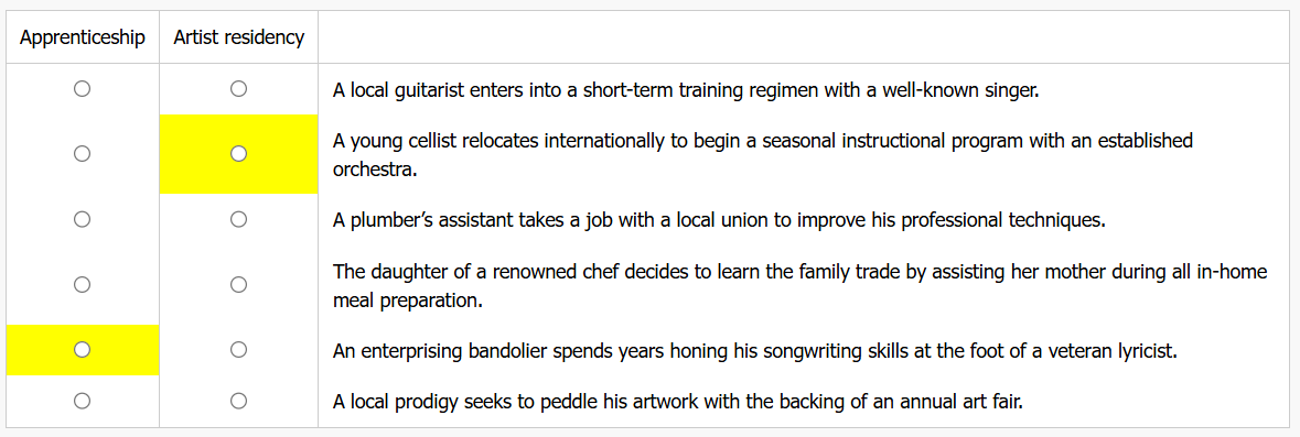 In the table, select a description of a program that, based on the information above, would most likely be categorized as an arts Apprenticeship and another description that would most likely be categorized as an arts Artist residency. Make only two selections, one in each column.