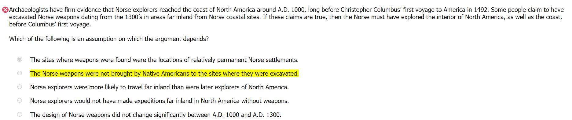 I need help understanding the correct option here. I understood that it was a good reasoning however didn't choose it cause it brought outside information as the passage doesn't mention native americans anywhere. So I thought since the assumption must be true for the argument to hold true - it is not necessary to bring in new information in the assumption. Had this been a strengthen or weaken question, I would have chosen option B. Can someone please help?