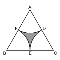 As it is an equilateral triangle, each angle = 60' (60*3=180), and thus we are dealing with a half a circle. To get the area of the shaded area we must subtract the area of the semi circle from the area of the triangle.