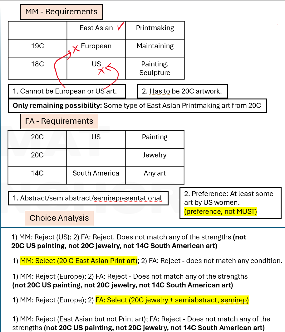 In addition, MM's next exhibit must be devoted to something other than European or US art and be restricted to the 20th century. FA's next exhibit must be devoted to art that is abstract, or at least art that is not fully representational (e.g. semi-abstract or semirepresentational) preferably including at least some art by US women.