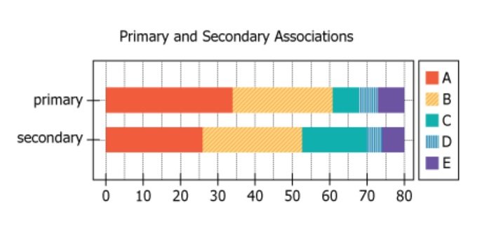 We have 80 attendees, if an attendee is chosen/selected randomnly, the association that was considered as either his primary choice or the secondary choice, the probability of it being Association A is higher, as it is considered as a primary by 34 attendees and secondary by 26. 34+26=60 the probability is higher clearly which is not the case for others. In case of B, its considered Primary by 26 attendees and secondary by 27 attendees, 26+27 = 53.
