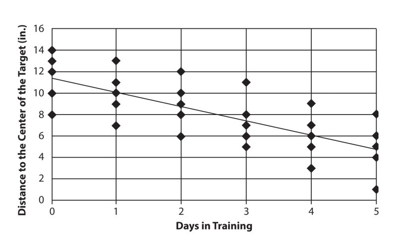 The question asks for the percent by which the number of students within 11 inches of the target’s center after day 2 is greater or less than it was before any training. Open the drop-down box and review the answer choices. More students were within 11 inches of the target after 2 days of training, so eliminate (A) and (B). Before any training, 2 students were within 11 inches of the target’s center. After 2 days of training, 4 students were within 11 inches of the target’s center. Use the percent change formula, (difference/original) × 100, to calculate the percent increase, which is equal to \(\frac{4-2}{2} × 100\), or 100%.