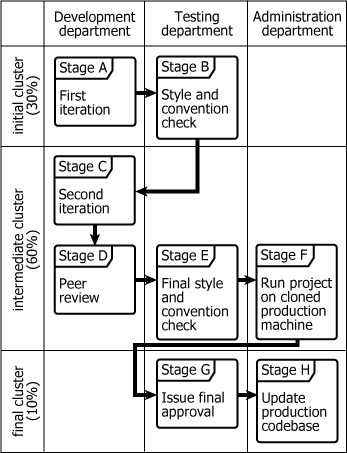 The diagram on the Stages and Clusters tab provides evidence against both the statement that the first stage of each project is handled by an individual from the administration department and the statement that final stage of each project is handled by an individual from the development department. It shows that Stage A, the first stage, is the responsibility of one or more individuals in the development department, and that Stage H, the final stage, is the responsibility of one or more individuals in the administration department.