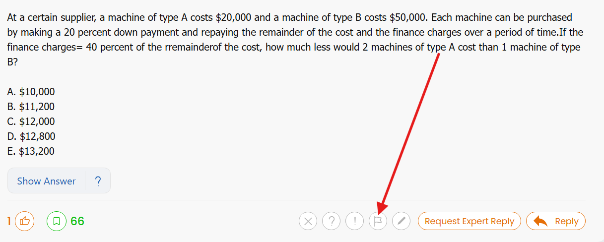 We are given that a machine of type A costs $20,000, and that a machine of type B costs $50,000. We are also given that each machine can be purchased by making a 20 percent down payment and repaying the remainder of the cost and the finance charges over a period of time.