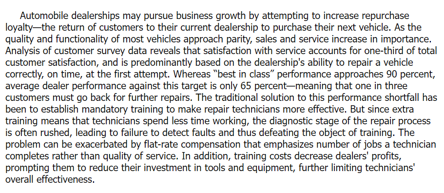 P1, S3: Analysis of customer survey data reveals that satisfaction with service accounts for one-third of total customer satisfaction, and is predominantly based on the dealership’s ability to repair a vehicle correctly, on time, at the first attempt.