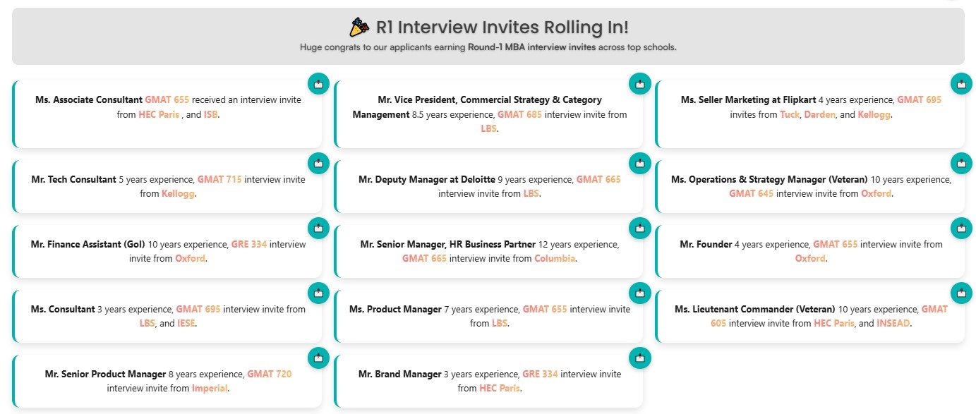 Over the past decade, we’ve helped candidates from a wide range of backgrounds secure admits to top programs like INSEAD, LBS, HBS, Wharton, and Oxford, with a 4.9/5 rating on GMAT Club and 1,000+ successful admits globally.